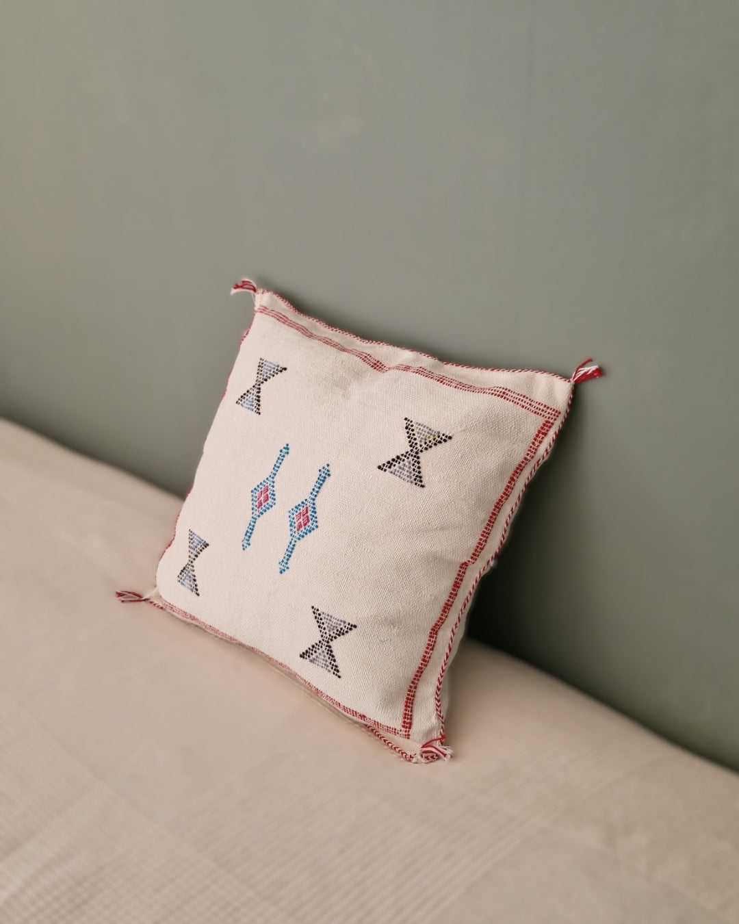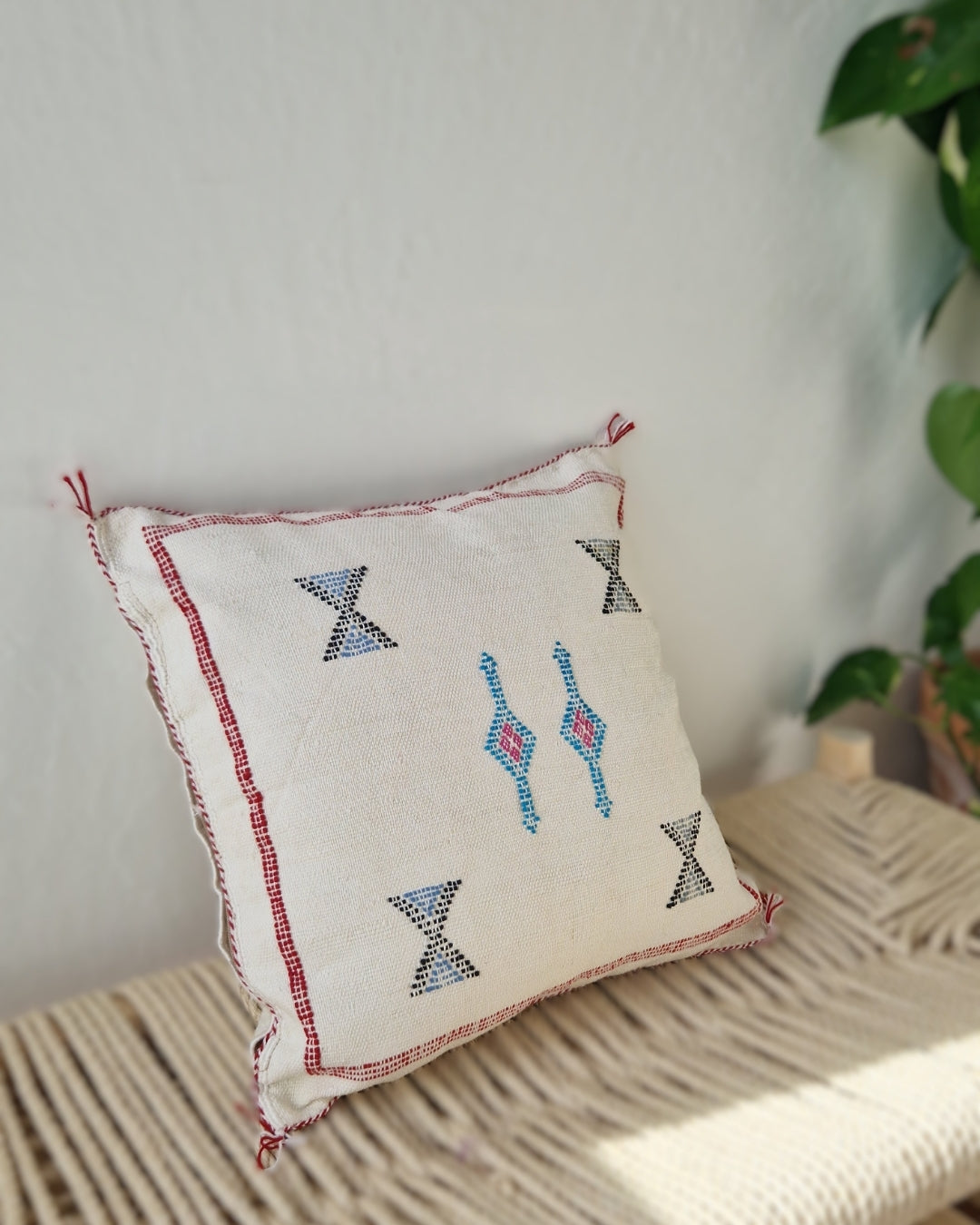 Ge ditt hem en unik och tidlös känsla med våra exklusiva, handgjorda kuddfodral i kaktussilke. Varje fodral är ett stycke autentiskt hantverk tillverkat av kaktusfibrer (även känt som Sabrasilke), vävt och broderat för hand av skickliga hantverkare i Marocko.