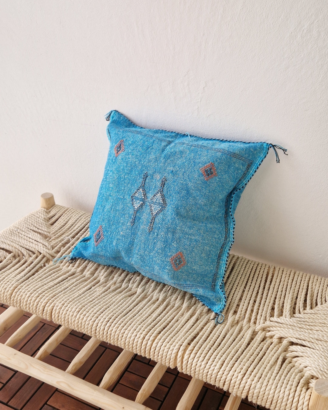 Ge ditt hem en unik och tidlös känsla med våra exklusiva, handgjorda kuddfodral i kaktussilke. Varje fodral är ett stycke autentiskt hantverk tillverkat av kaktusfibrer (även känt som Sabrasilke), vävt och broderat för hand av skickliga hantverkare i Marocko.