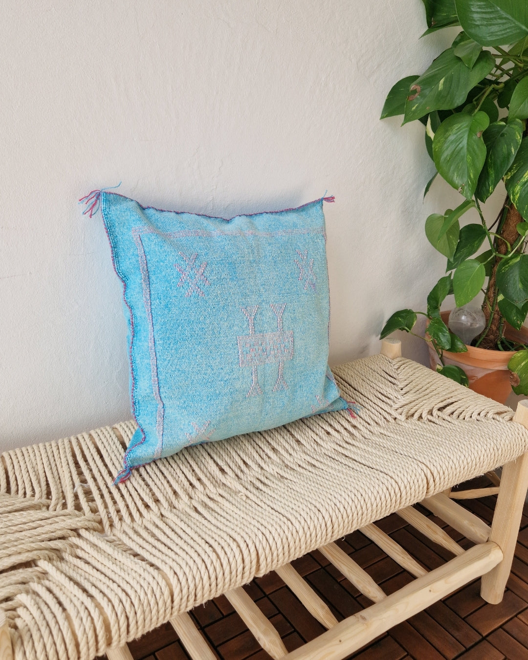 Ge ditt hem en unik och tidlös känsla med våra exklusiva, handgjorda kuddfodral i kaktussilke. Varje fodral är ett stycke autentiskt hantverk tillverkat av kaktusfibrer (även känt som Sabrasilke), vävt och broderat för hand av skickliga hantverkare i Marocko.