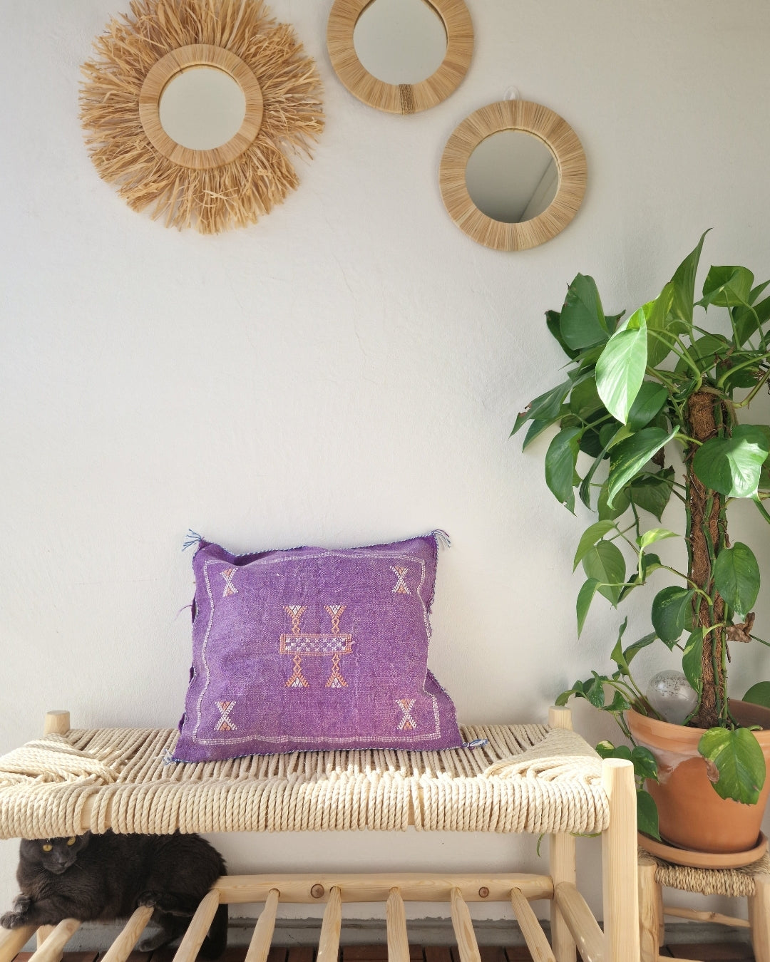 Ge ditt hem en unik och tidlös känsla med våra exklusiva, handgjorda kuddfodral i kaktussilke. Varje fodral är ett stycke autentiskt hantverk tillverkat av kaktusfibrer (även känt som Sabrasilke), vävt och broderat för hand av skickliga hantverkare i Marocko.